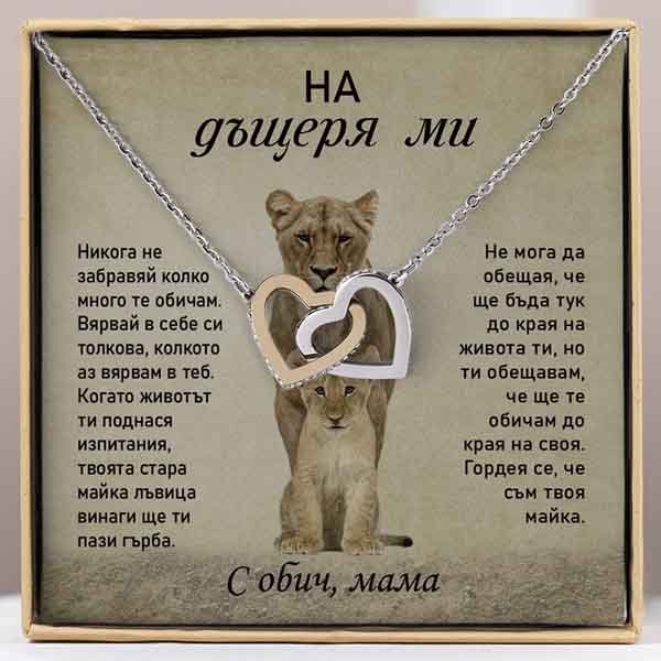 Колието представлява красив символ на любовта, който съчетава елегантен дизайн и дълбока емоционална стойност. С мотив от две преплетени сърца, това колие символизира заедността и вечната любов, което го прави идеалният подарък за любим човек.