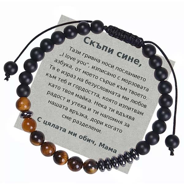 Тази гривна носи посланието „I love you“, изписано с морзовата азбука, от моето сърце към твоето. Тя е израз на безусловната ми любов към теб и гордостта, която изпитвам като твоя майка. Нека ти вдъхва радост и утеха и ти напомня за нашата връзка, дори когато сме разделени.