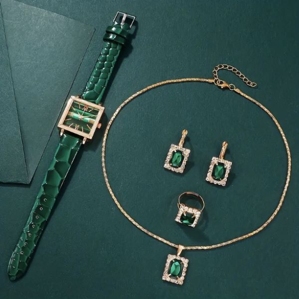 Този шикозен ансамбъл включва винтидж кварцов часовник с квадратен циферблат в поразителни зелени нюанси, допълнени от ослепителен комплект бижута с кристали, което ви позволява да повишите собствения си стил и да споделите елегантността с близките си. 🎁⌚